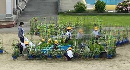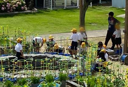 1年生は朝顔、2年生はミニトマトをそれぞれ育てています。