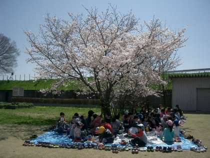 いきいき活動のみんなが桜満開の下でお弁当を食べています。 みんな、おいしそうに食べていました。