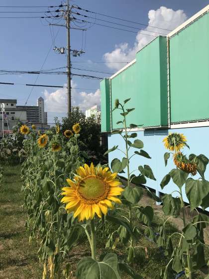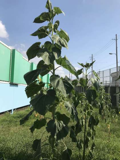 1学期に子どもたちが草ぬきしたり、水やりしたりお世話したひまわりもこんなにも大きくなりました。
