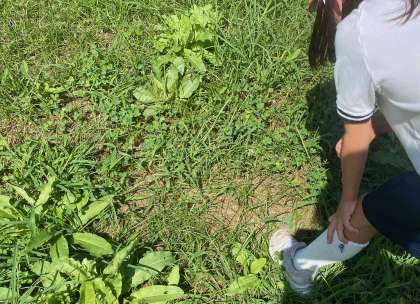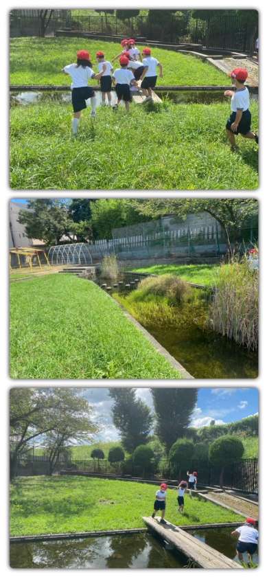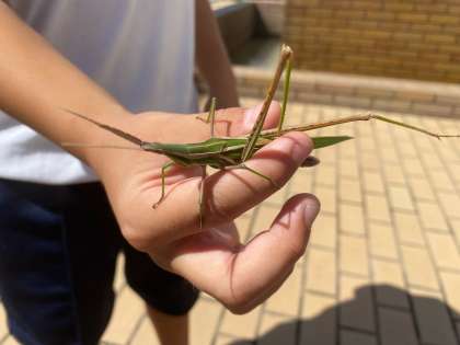 池の周りを飛ぶ色々な色のトンボを見つけたり、草むらを走っていると、ビョーンとはねるバッタを見つけたり、木の周りや土のあたりを探したりしました。