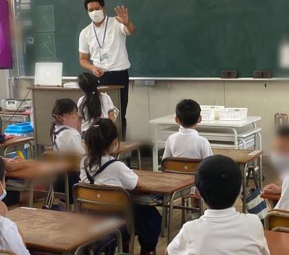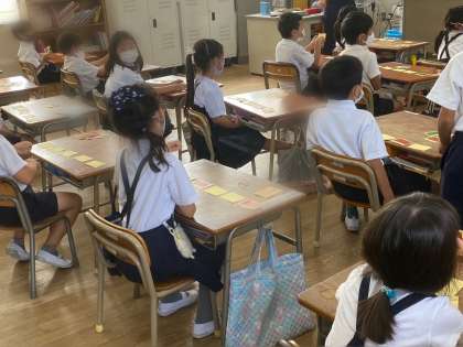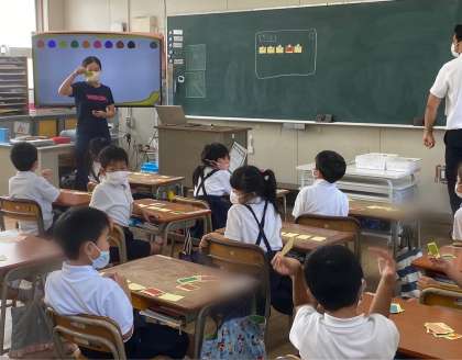 C-NETの先生と、英語の学習をしました。カラーのゲームで、担任の先生が示すカラーカードをよく見て、よく聞いて探しました。C-NETの先生と対決だったので、みんな夢中になっていました。
