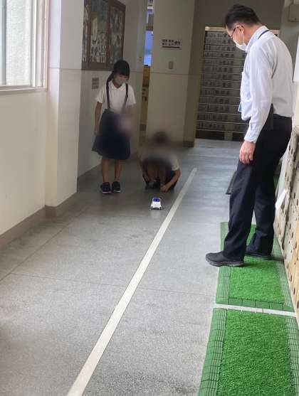 コーディロッキーを走らせることができるようになったことが嬉しくて、校長先生に見てもらいたかったようです。校長先生の近くに持って来て見せて、走らせて楽しんでいました。