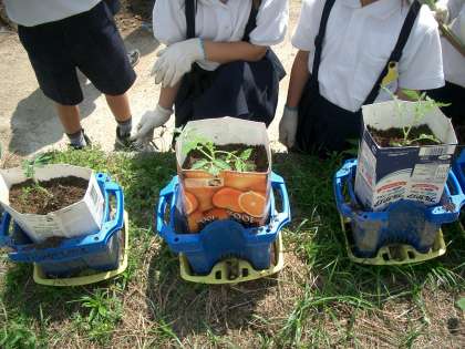 ・地域の見守り隊の西川さん、赤桐さんから植え方を