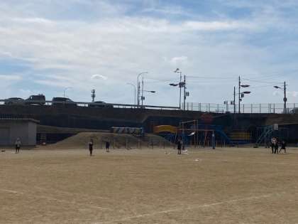 運動場を思い切り走ってあげました。風が助けてくれて、どんどん高く上がりました。運動場のはしを走ってしまって、凧が木に引っかかり、紐を動かしながら木から凧を外している人もいました。