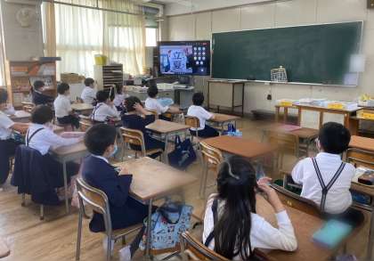 入学から1か月たって…ということで、児童朝会の中で、リモートで1年生みんなと他学年が顔を合わせました。校長先生がカメラを持って1年生の教室を撮影しに行きました。