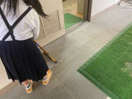 教室以外の学級の担当場所の掃除の仕方を覚え、マットなども動かして丁寧に掃いています。