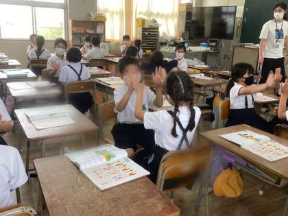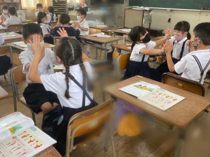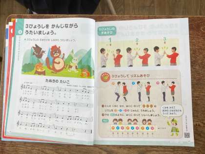 「たぬきのたいこ」の歌を歌いながら、近くの席の友だちと3拍子の手遊び、リズム遊びをしました。