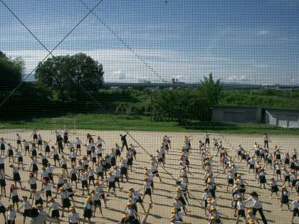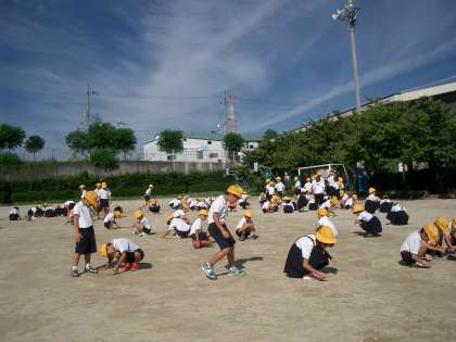 今日は児童朝会後、ラジオ体操と石拾いをしました。