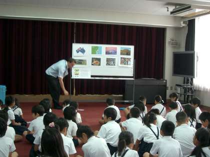 毎週月曜日に来てもらっている、外国語活動担当のミック先生が多目的室で3年生に指導をしてもらっているところです。