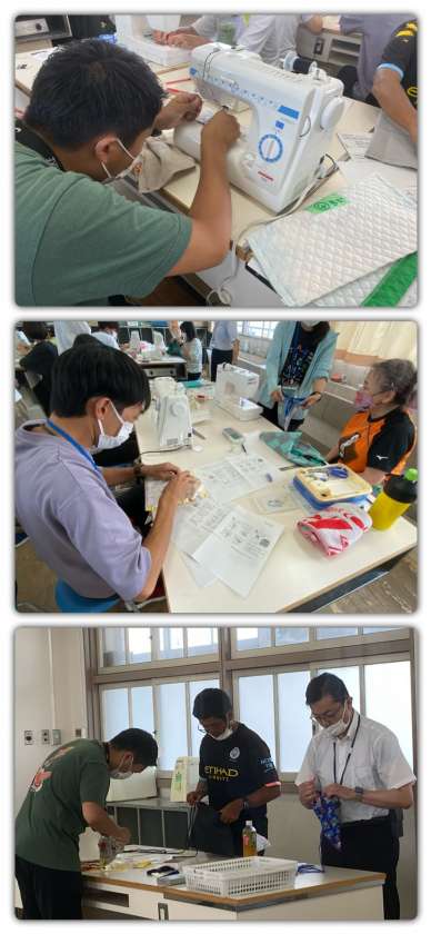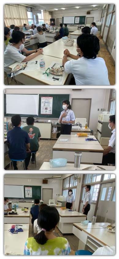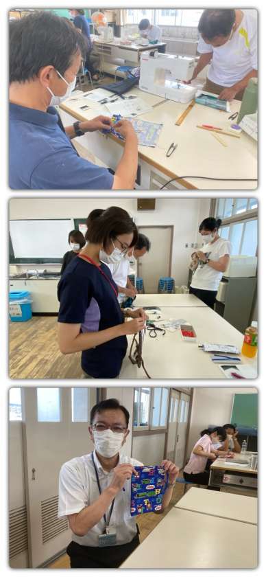 写真は、家庭科の研修の様子です。川辺小学校に3年前まで校長先生でいらした大野校長先生から教えていただきました。資料から学び方、指導の仕方を丁寧に教えていただいた後、ミシンの実技研修も行いました。すいすいと作ることができた先生もいましたが、紐の通し方や縫い方がうまくいかず、苦戦している先生もいました。でも、みんな色のバランスを考え、わくわくしながら作っていました。
