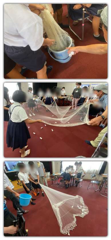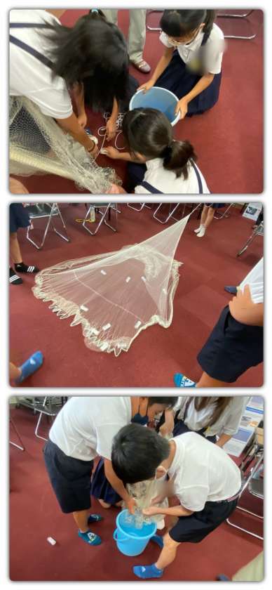 大和川では、投網や定置網の体験が現在できないため、多目的室の中で、投網で魚を捕獲する体験をしました。