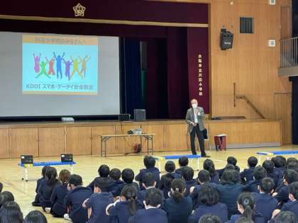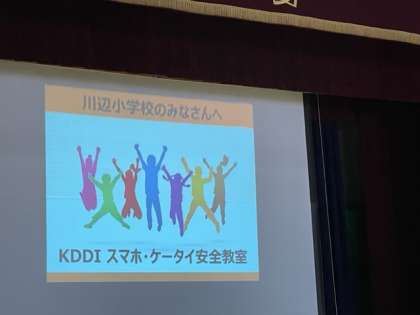 1.2.3年生が2時限目に、4.5.6年生が3時限目に講堂で、スマホ ケータイ安全教室を実施しました。KDDIから講師をまねいて、スマホを使う上での危険性や、ルールを守ることの大切さをわかりやすく教えてもらいました。