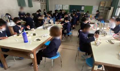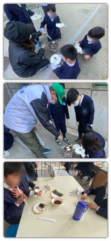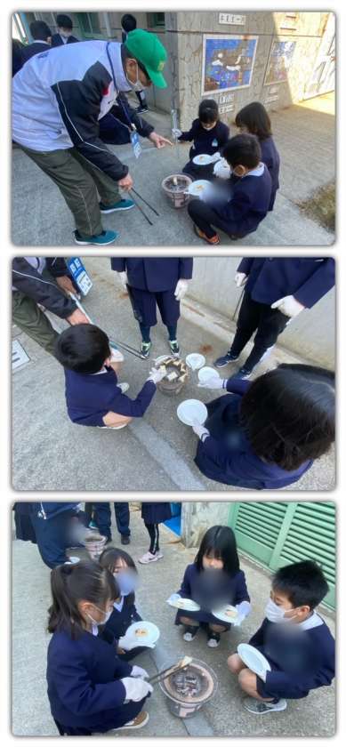 地域の方に教えていただいて、昔の道具の体験で、七輪を使って、餅を焼きました。