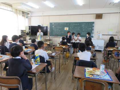 給食当番は、協力して安全に運び上手に盛りつけています。