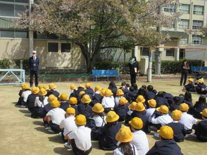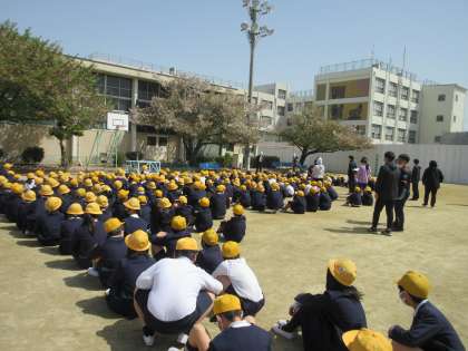 今日は火災が発生という想定で訓練を行いました。子どもたちは緊急放送を静かに落ち着いて聞き、速やかに運動場に避難することができました。避難の時の約束「おはしも」(おさない はしらない しゃべらない もどらない)をおさらいし、災害時の避難方法や身の守り方を学びました。