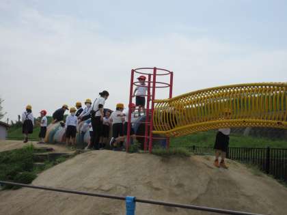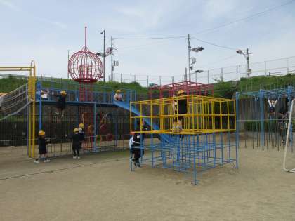 川辺小の先生たち、サポーターの先生たちと一緒に遊具を使ったり、鬼ごっこをしたりして楽しく活動しています。とっても楽しそうです。