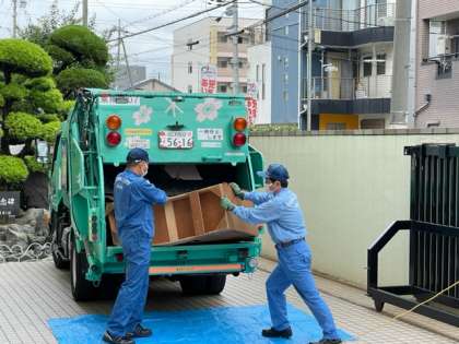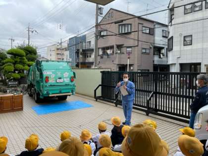大阪市環境局から、4年生に ごみ清掃車の出前授業学校ありました。間近で、粗大ゴミ(タンス)が吸い込まれていく様子等を見させてもらいました。