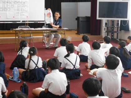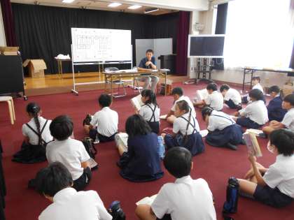 9月27日(水) お米マイスターの資格をもたれる、地域の西川さんにお越しいただき、5年生に、「お米」についての出前授業がありました。世界各地のお米のこと、稲狩りから、白米に精米されるまで、などのお話を実物を交えて教えていただきました。