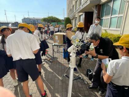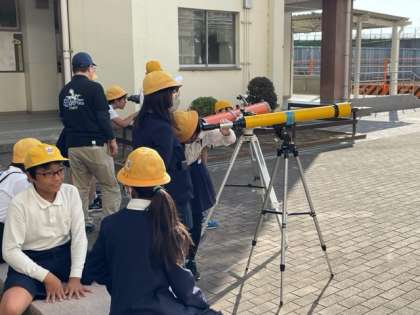講堂で、天体のことについて学んだあと、中庭で実際の天体望遠鏡を使って、太陽の黒点観測を行いました。