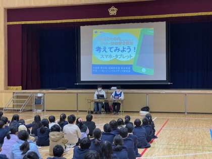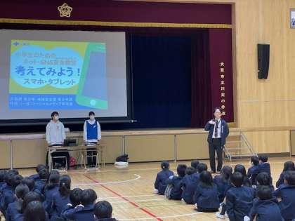 1月19日.大阪府警から、サイバーセキュリティー対策課の方に来ていただいて、3.4.5.6年生対象に、インターネットを使う上での注意などのお話しを聞きました。