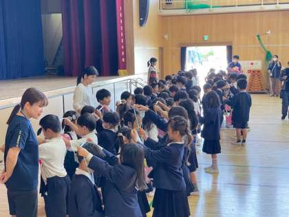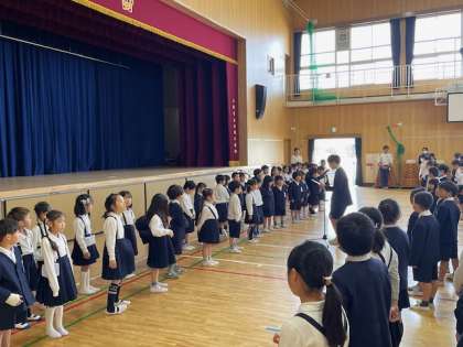 4月22日 朝の時間に、対面式を行いました。入学して2週間がすぎました。体育館で2年生から6年生と対面しました。2年生からはメダルが送られました。