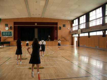 ・運動会の練習で使った講堂をきれいにしています。