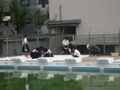 ・組体操でジャンプに使ったシートをきれいに拭いています。