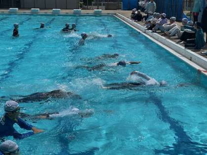 7月17日の2.3時限目、5.6年生が、服を着たまま水に落ちた時にどうしたらいいかを、体験しました。服は、まとわりついてたいへん泳ぎにくくなります。いい体験になりました。