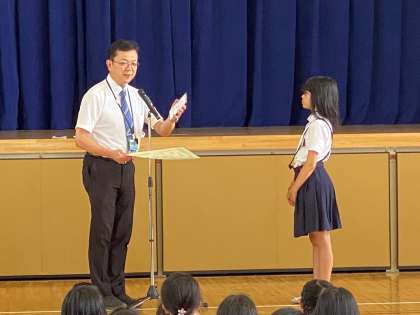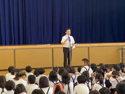 1学期の終業式は5時間目体育館で行いました。校長先生から、明日から39日間の夏休みが始まります。この39日間、一日一日を有意義に過ごすことができるために、3つのことを教えていただきました。まず、早寝・早起き・朝ごはんをしっかりとまもること、つぎに、人に嫌なことを言ったりしたりしなで楽しく過ごすこと、最後に、健康に気をつけて過ごすことのお話を聞きました。生活指導の先生からは、からだを大切にする方法や、心を大切にした夏休みの過ごし方についのお話をお聞きした後、そして、「社会を明るくする運動標語」部門では6年生の児童が佳作賞に選ばれ、校長先生からの表彰状を授与していただきました。最後にみんなで心をあわせて校歌を斉唱しました。