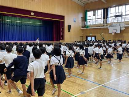 10月3日は、朝から雨のため、運動会の全体練習を体育館で行いました。開会式の流れを確かめたり、行進のしかたを確かめたりしました。