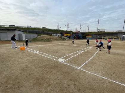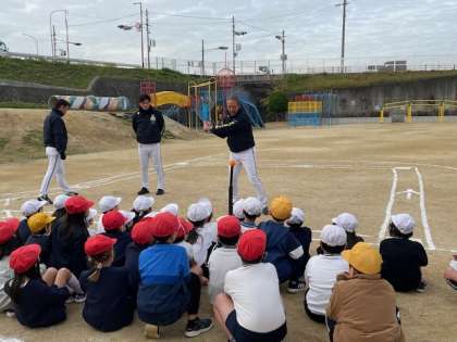 オリックスバッファローズのコーチの方に来ていただき、2.3年生を対象に、ティーベースボールを、教えていただきました。
