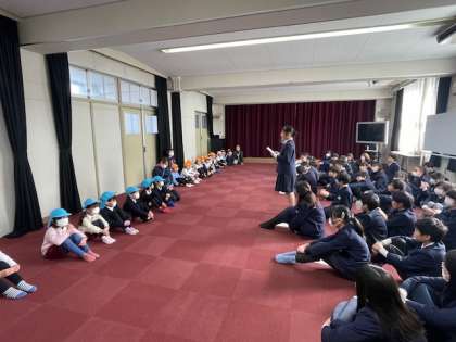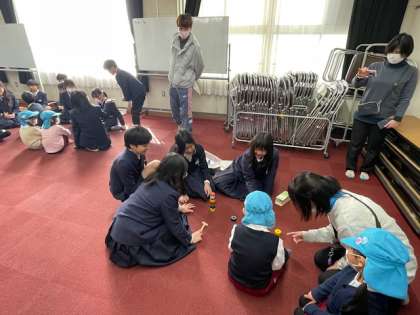 2/25(火)の2・3時限目に 「長吉幼稚園」「長吉第3保育所」の年長さんをお招きして、交流会を行いました。2限目は5年生が、けん玉などの「昔あそび」を一緒に行いました。