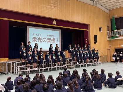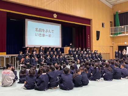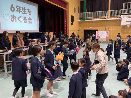 6年生からお礼の言葉と、「栄光の架け橋」のメロディーで5年生の名前を呼びました、そのあと、手作りの「ぞうきん」と「毛糸たわし」が贈られました。