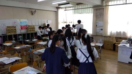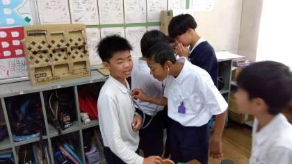 自分の手で心臓の動きを確かめた後、男女に分かれて聴診器で音を聞きました。