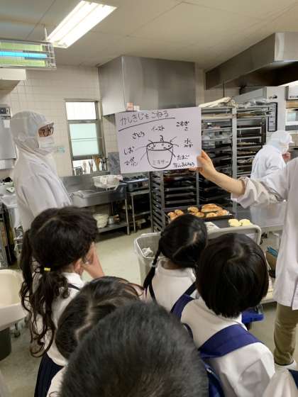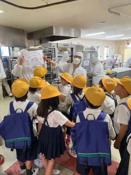 パン作りについて説明していただいたり、パン生地を触ったりしました。生地の匂いを嗅いで、「甘い匂いがする〜」と興味津々な子どもたちです。