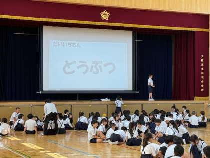 6月5日(木)の朝の時間、児童集会を行いました。集会委員会のみんさんが、お題をだします。そのお題で一番長い言葉を考えるゲームです。