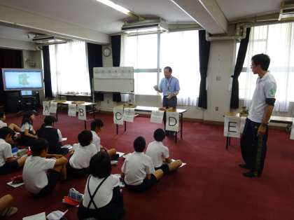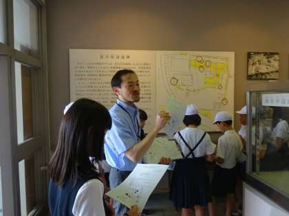 多目的室では、クイズ形式で、縄文時代・弥生時代・古墳時代・奈良〜平安時代・鎌倉時代・江戸時代の遺物を手に取りながら学びました。貴重な遺物を手に触れることによって子どもたちは意欲的に学習することができました。