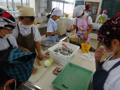 もう少しで夏休みです。5年生は、今月27日〜29日の林間学習に向けて、係を決めたり、キャンプファイヤーのスタンツの練習を練習をしたりしています。また、暑い中、家庭科室で慣れない手つきで、カレー作りをするなど林間の準備をしています。お天気も含めてよい林間になることを願っています。
