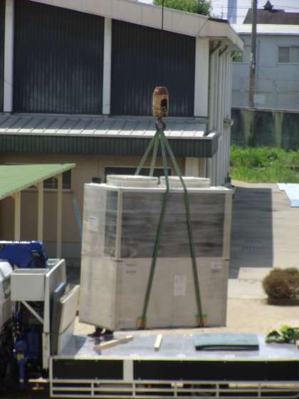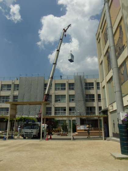 室外機を屋上に運ぶ作業がありました。大きなクレーンが中庭や運動場に入り、作業をしていました。作業後は、作業員の方が、轍をトンボでていねいにならして整地してくださいました。