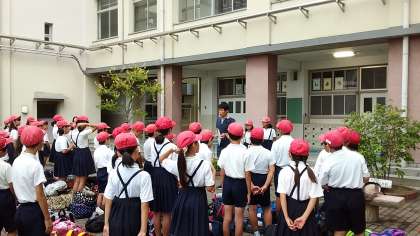 5年生の子どもたちは今日から林間学習です。多くの保護者が見守る中、出発式をおこないました。2泊3日の活動の始まりです。2台のバスに乗って、鉢伏高原へ向けて出発しました。