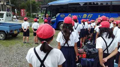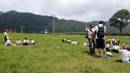 5年生の子どもたちは無事鉢伏高原に到着しました。開舎式では宿舎「こだま」の代表の方にごあいさつをしました。これから宿舎前に広がる鉢伏高原の大自然の中で、お弁当をいただきます。