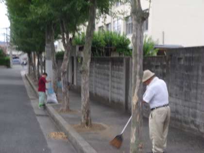 9月1日(木)の始業式に向けて、悪天候の中早朝より通学路の清掃をしていただきました。街路樹の根元に生えた雑草を抜いていたただいたり、落ち葉を集めていただき、大変きれいになりました。ありがとうございました。1日に子どもたちは気持ちよく登校できると思います。
