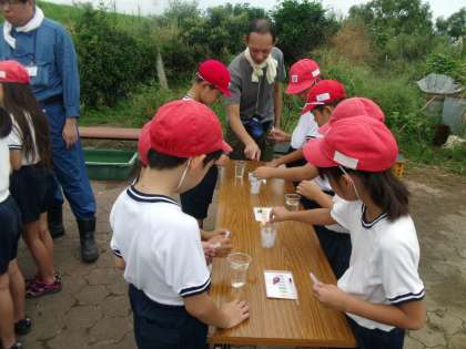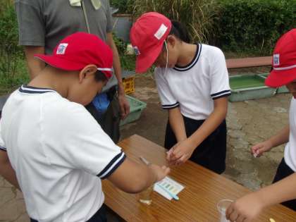 大和川の水をパックテストで汚れ具合を調査しました。大和川の水のきれいさに子どもたちが気づいていました。