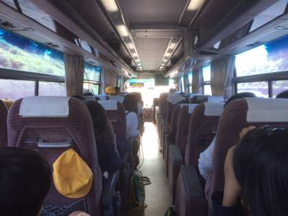 楽しいバスの時間を過ごしています。バスの中ではおやつタイムやクイズ大会をおこなっています。
