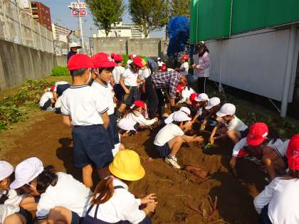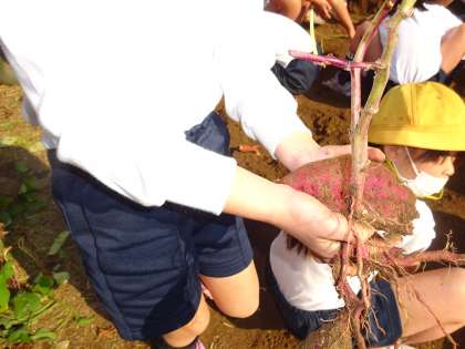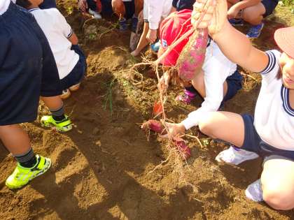 2年生がさつまいもの収穫をしました。どんなおいもが出てくるのが、楽しみでがんばってほりました。見守り隊の西川さんと辻岡さんと一緒にほりました。両手でつつむような大きなおいもが出てきました。