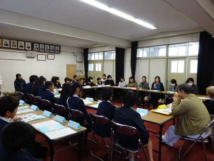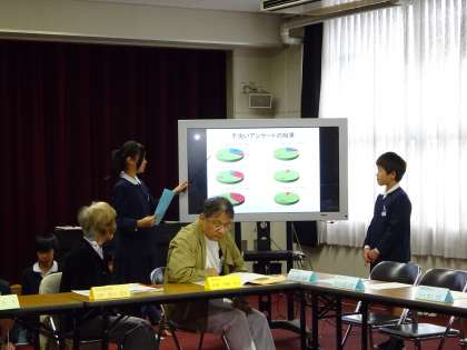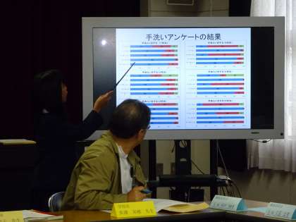 昨年より年1回開いています。今回は、代表委員会の児童も参加して、意見を交わしました。今回は、「ていねいな手洗いで 感せんしょうを予防しよう」をテーマに健康委員会の子どもたちが調べたことアンケート結果を発表しました。