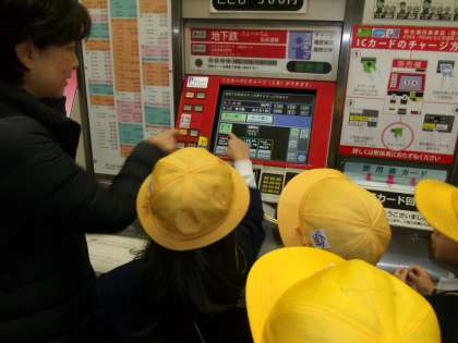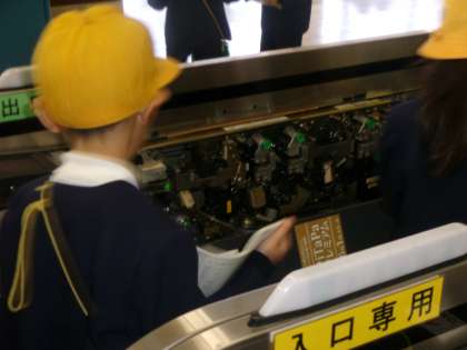 長原駅から八尾南駅まで電車に乗りました。今回は、切符を一人一人が自動券売機で購入しました。また、班ごとに乗車しました。八尾南駅に着いて、3グループに分かれて、八尾南・喜連瓜破・文の里のそれぞれの駅長さんから説明をしてもらったり、券売機の裏を見せてもらったり、駅長室の設備を体験させてもらったり日頃体験できないことができました。