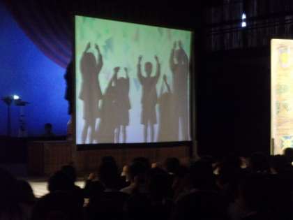 劇団かかし座による「長靴をはいた猫」を鑑賞しました。鑑賞前に影絵の仕方を教えてもらい、代表の子どもや先生が実際に体験しました。迫力ある劇で子どもたちが見入っていました。