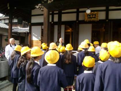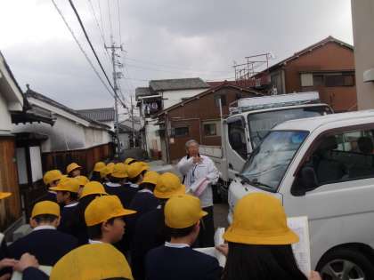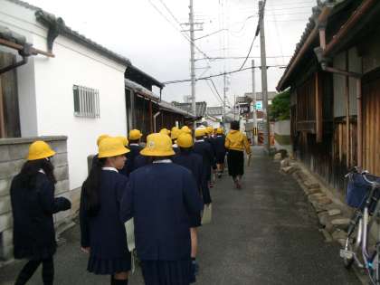 5年2組の子どもたちが、いつもお世話になっている登校見守り隊の辻岡春美さんに昔の川辺のことを教えていただきながら川辺地域を回りました。今はなくなってしまった商店の面影を見たり、今も営んでいる商店の方にお話を聞かせてもらったりしました。また、専竜寺では、ご住職にお話を聞いたり昔の教科書を見せていただいたりしました。子どもたちは、日頃過ごして地域にたくさんの商店があったことを知ることができました。1組は、9日金曜日に回る予定です。