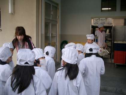 ≪調理員さんに気を付けてもってね、とやさしく声をかけてもらっています≫